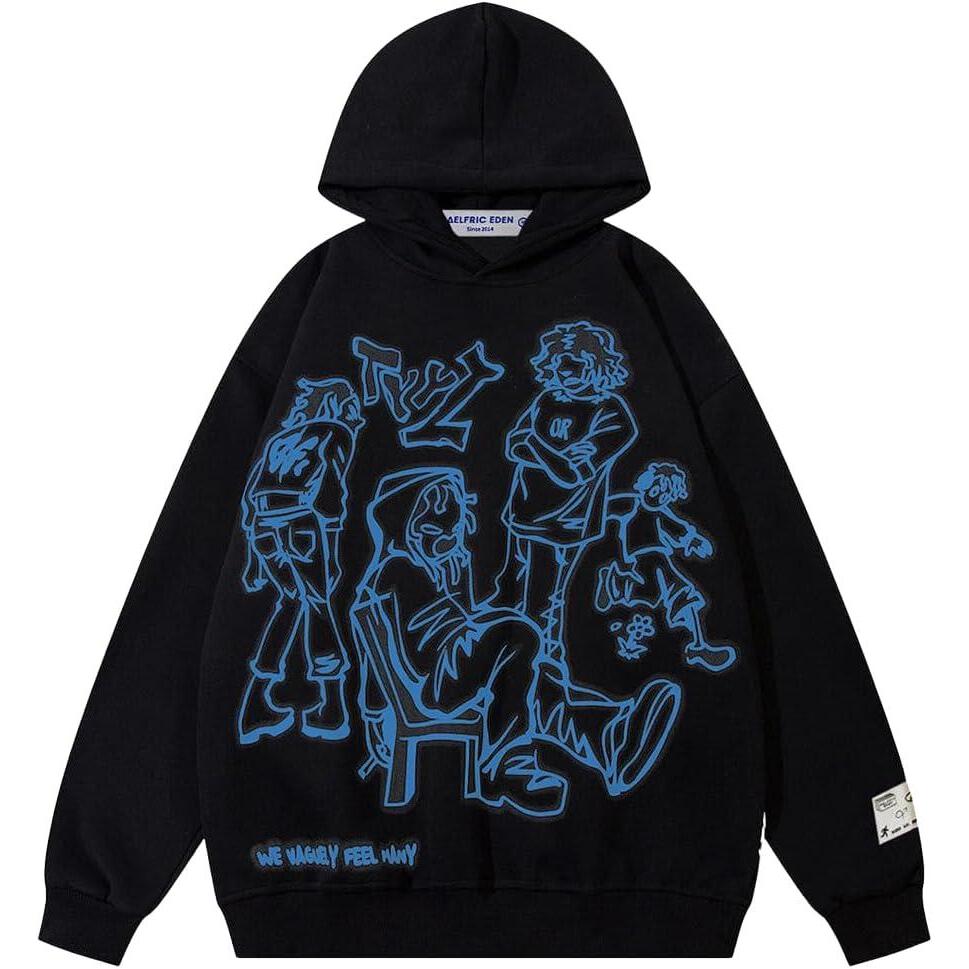 Aelfric Eden Mens Graphic Oversized Hoodie Cartoon Character Print Streetwear Casual hoodies y2k Hooded Sweatshirt(Black Blue)