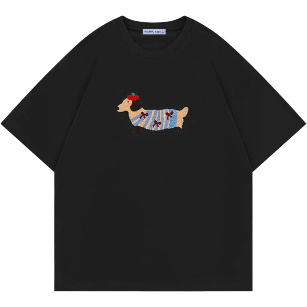 Aelfric Eden Mens Oversized Graphic Tees Dog Embroidery Casual Women Tshirts Short Sleeve Top Cotton Cute Tee Shirt(Black)
