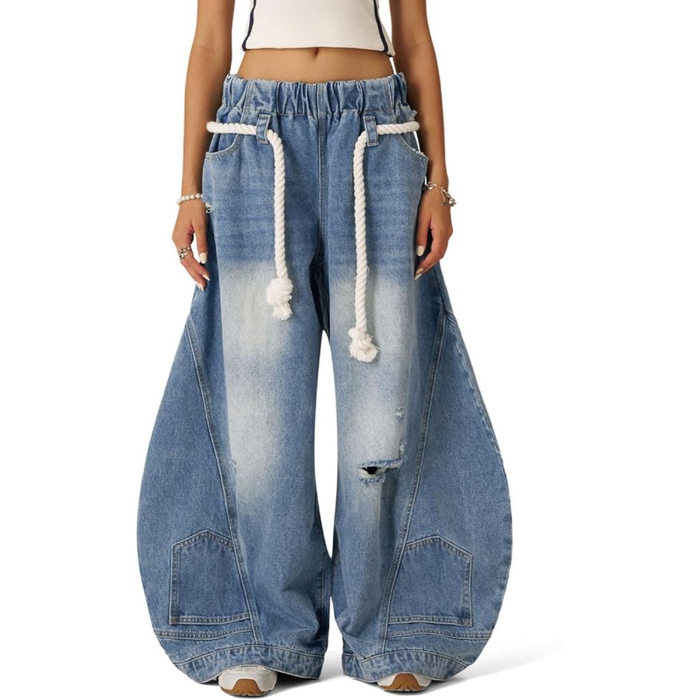 Aelfric Eden Baggy Barrel Jeans Reverse Loose Ripped Denim Pants for Women Men Elastic Waist Streetwear Y2k Trousers(Blue)