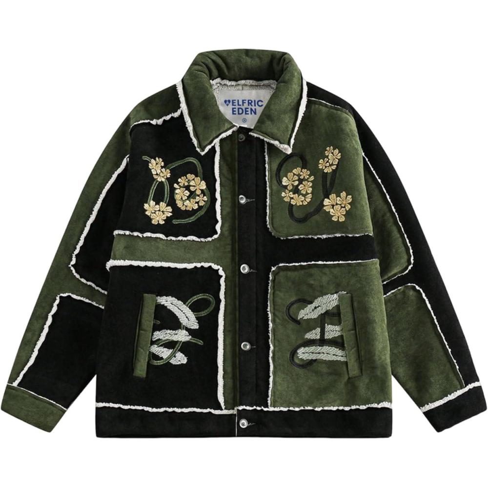 Aelfric Eden Jackets Color Blocking Embroidery Flower Coats Casual Soft Warm Fleece Lined Jacket 2025 Trendy Tops(Green)