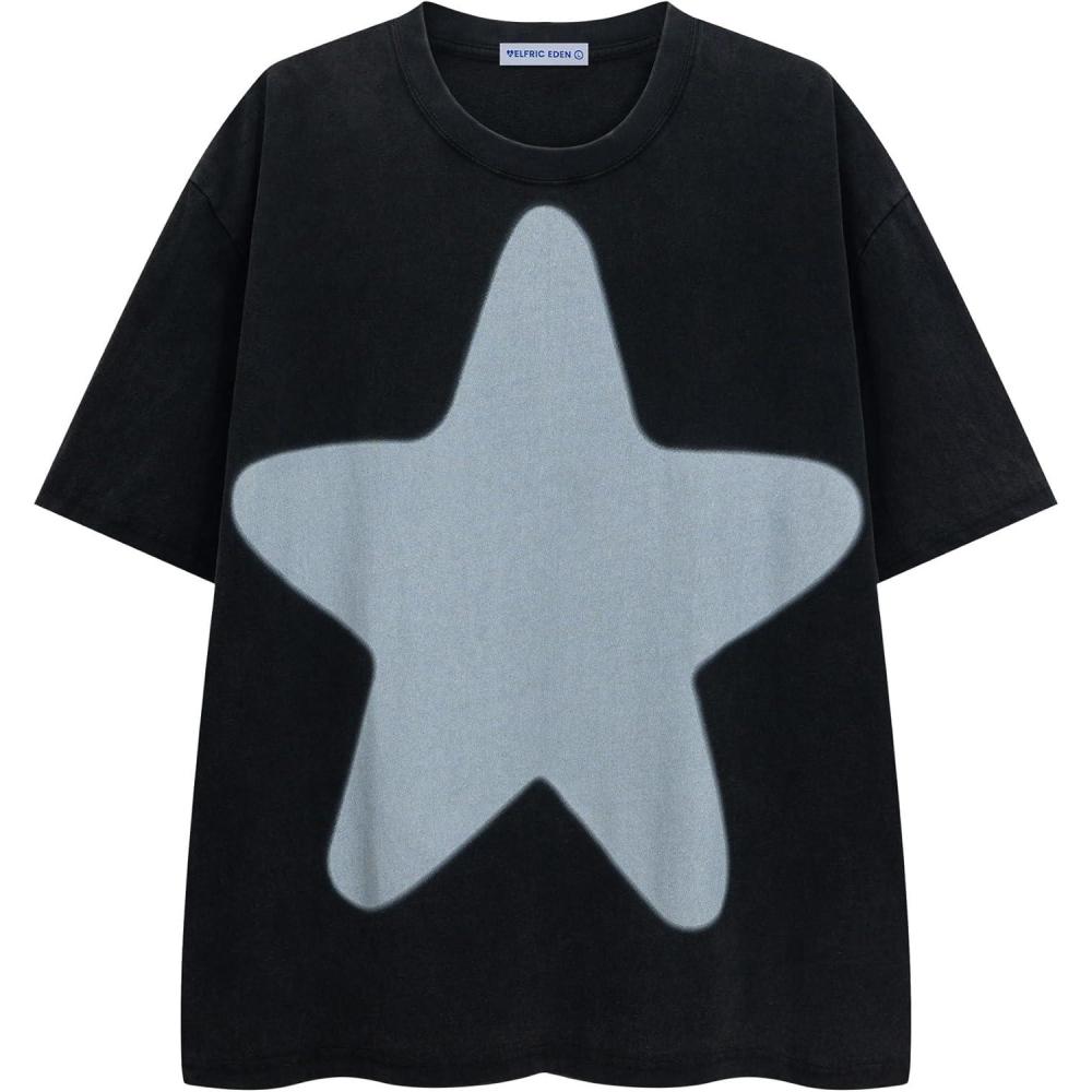Aelfric Eden Oversized Star Graphic Tees Men Vintage Washed Heavyweight Cotton Trendy Streetwear T Shirts Unisex(Black)