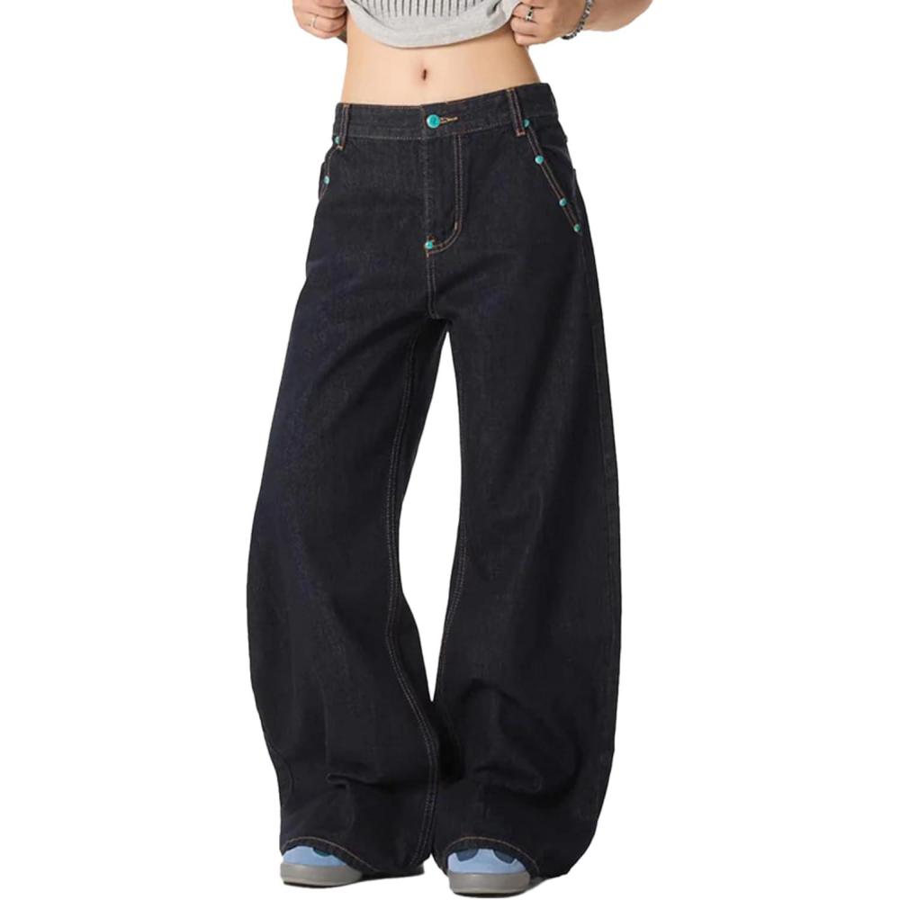 Aelfric Eden Baggy Jeans for Women Vintage Rivet Barrel Jeans High Waisted Wide Leg Y2k Streetwear Pants(Black)