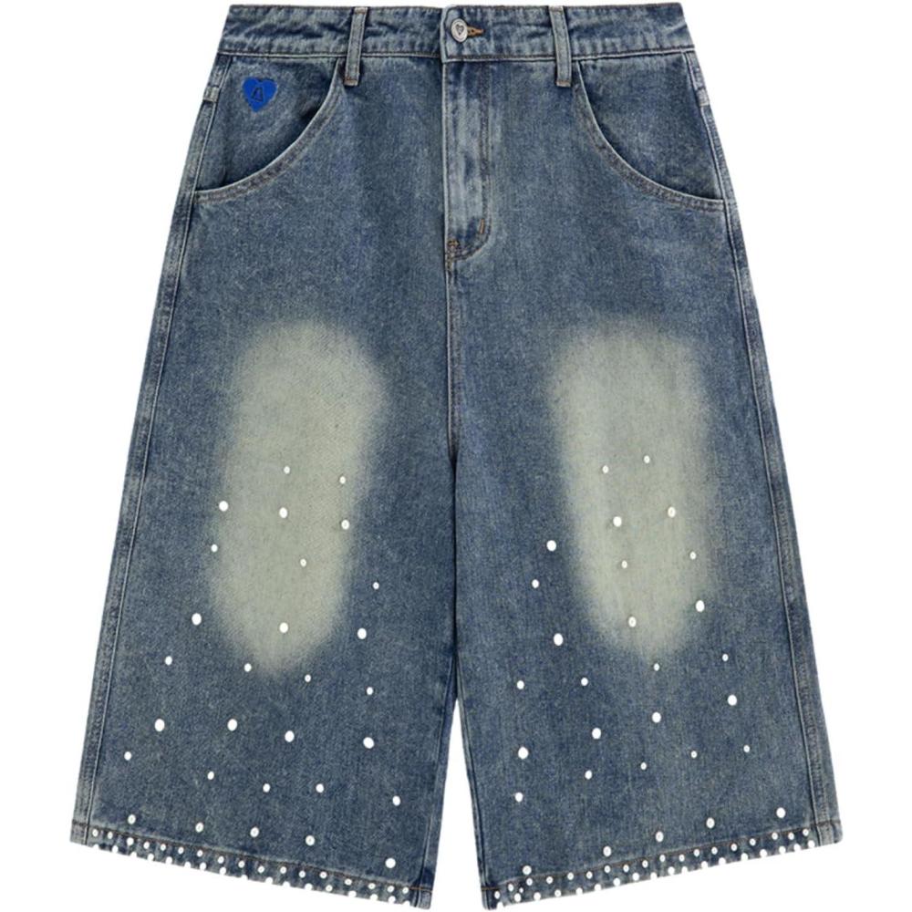 Aelfric Eden Baggy Jorts Pearl Embellished Jean Shorts for Women Mens Streetwear Summer Casual Denim Shorts(Blue)