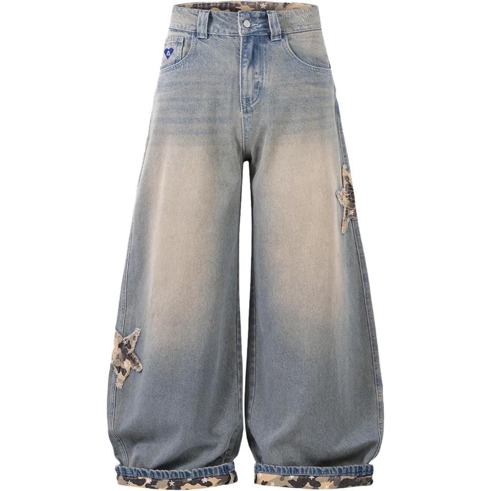 Aelfric Eden Baggy Jeans Mens Camo Star Cuffed Wide Leg Jeans Loose Fit Vintage Streetwear Y2k Denim Pants(Blue)