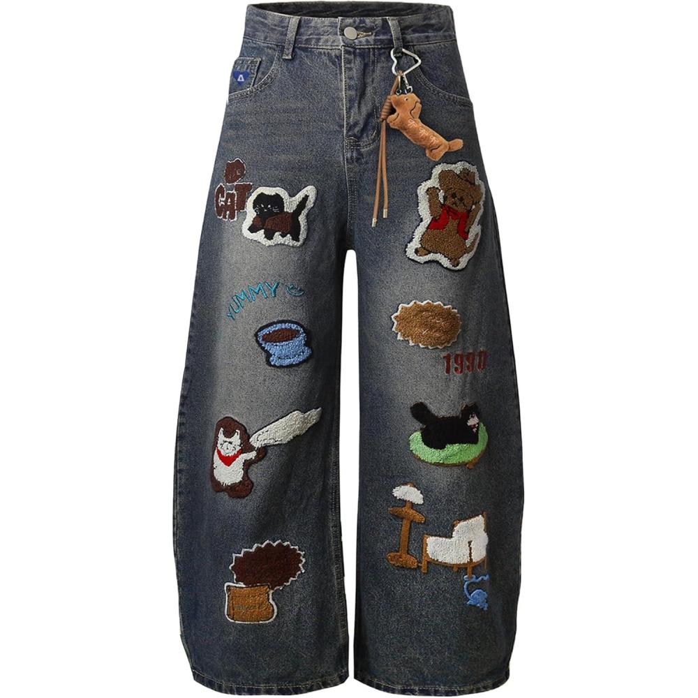 Aelfric Eden Baggy Jeans for Women Animal Applique Embroidery Barrel Jeans Y2k Streetwear Wide Leg Denim Pants(Dark Blue)