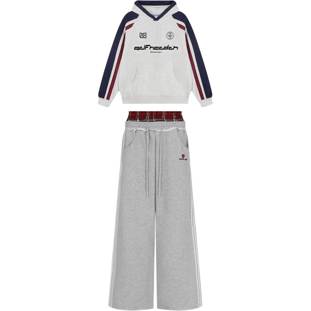 Aelfric Eden Plaid Patchwork Baggy Wide Leg Sweatpants and Racing Graphic Hoodies Womens Sweatsuits 2 Piece Set Grey XS